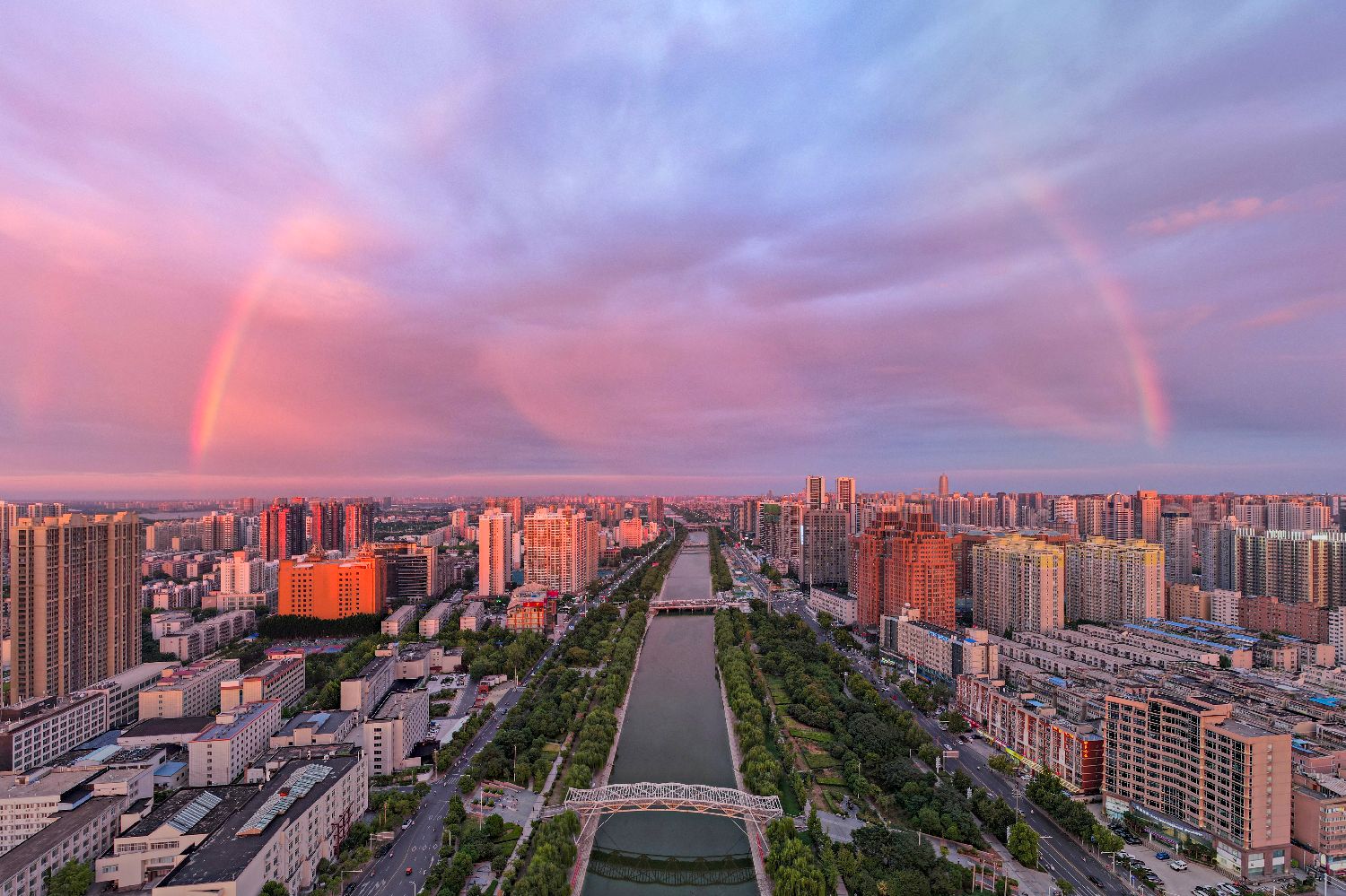 图为28日,河南郑州上空出现晚霞与彩虹齐争艳的壮丽景观。(中新社)