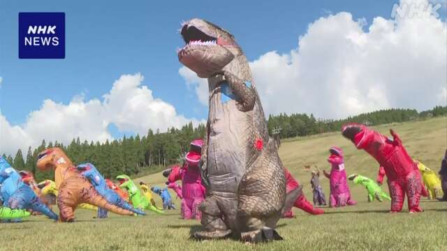 日本福井县胜山举办蒂拉诺恐龙装奔跑比赛