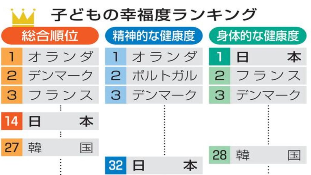 该调查主要评估经济合作与发展组织(OECD)和欧盟(EU)成员国儿童在“心理健康”、“身体健康”以及“学力与社会技能”三大领域的表现。其中,日本儿童的“身体健康度”连续两届排名第一,反映出较低的肥胖率。然而在“心理健康度”方面却严重落后。“学力与社会技能”方面则从2020年的第27位跃升至第12位,使日本的综合排名提升至第14位(2020年为第20位)。