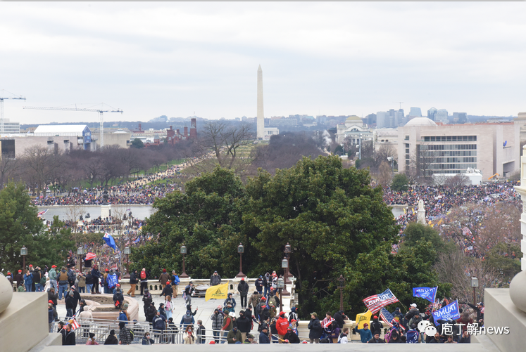 14时33分,当我望向窗外时,国会大厦西侧为总统就职典礼搭建的礼台已完全被示威者占据。一位示威者甚至爬上了国会大厦二层窗台。
