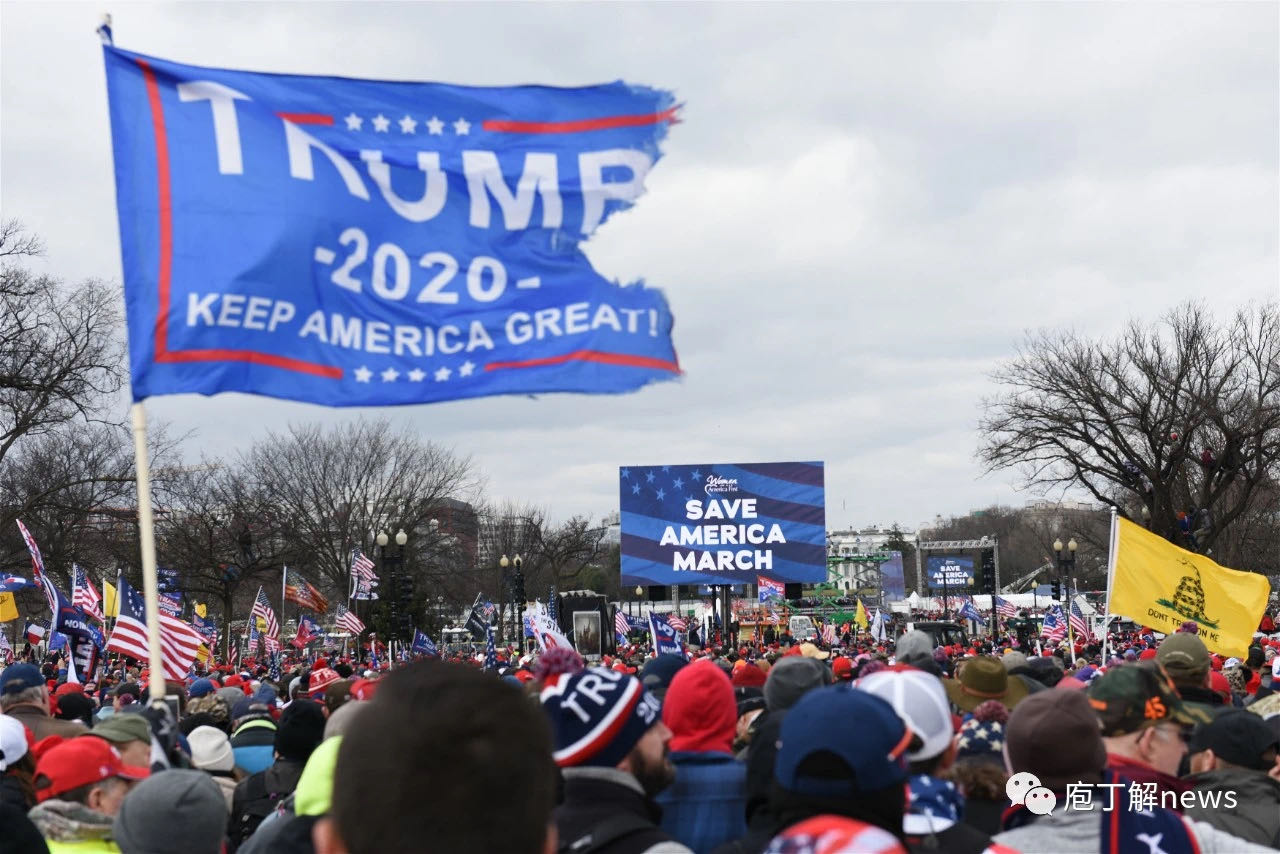 整个国家广场已经戒严。华盛顿纪念碑下,除了支持特朗普的蓝色旗帜,飘扬的加兹登黑蛇旗十分显眼。这面鲜黄色的旗帜是美国独立战争时期将领加兹登设计的美国国旗。在现代美国的政治语境中,它常被保守派用作持枪权和有限政府的象征。