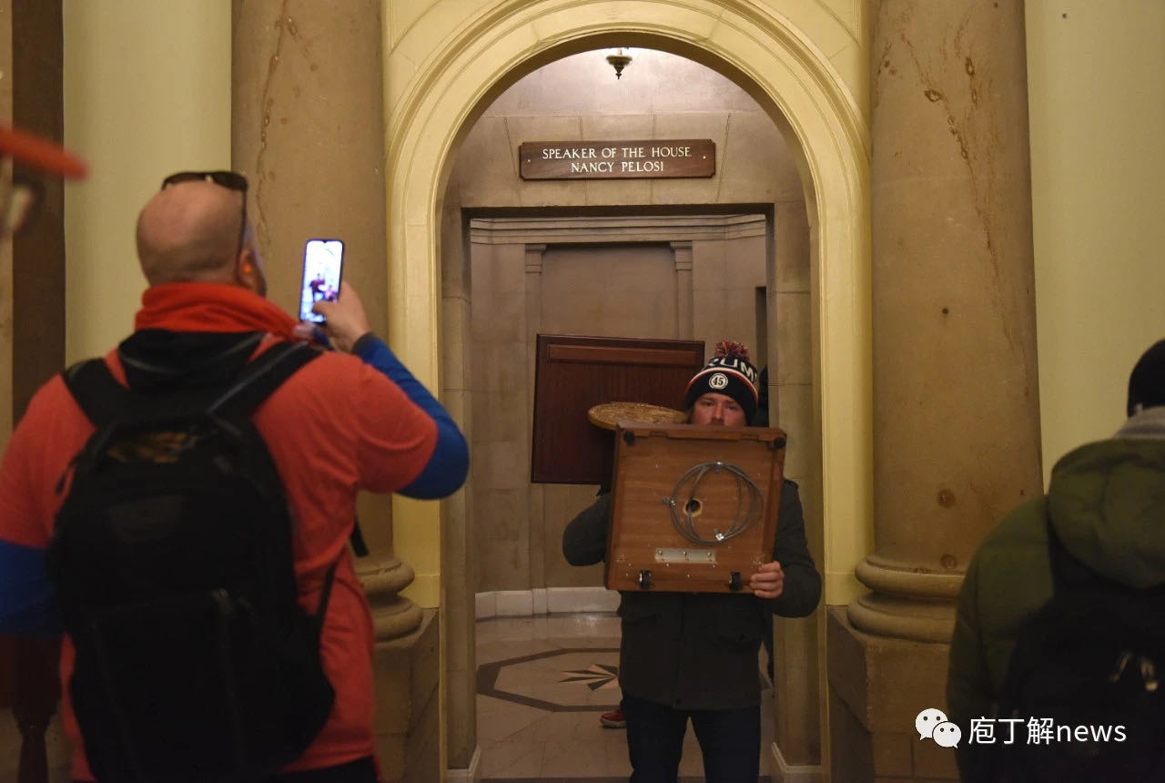 国会大厦内部警力薄弱。警方让出了中央大厅和雕像大厅等空旷区域,试图在参议院和众议院的入口阻挡示威者进一步闯入。但很快这两处美国政治的核心地带,也被突破。示威者冲入众议院议长佩洛西的办公室,我拍下了示威者搬出一个木制讲台的瞬间。
