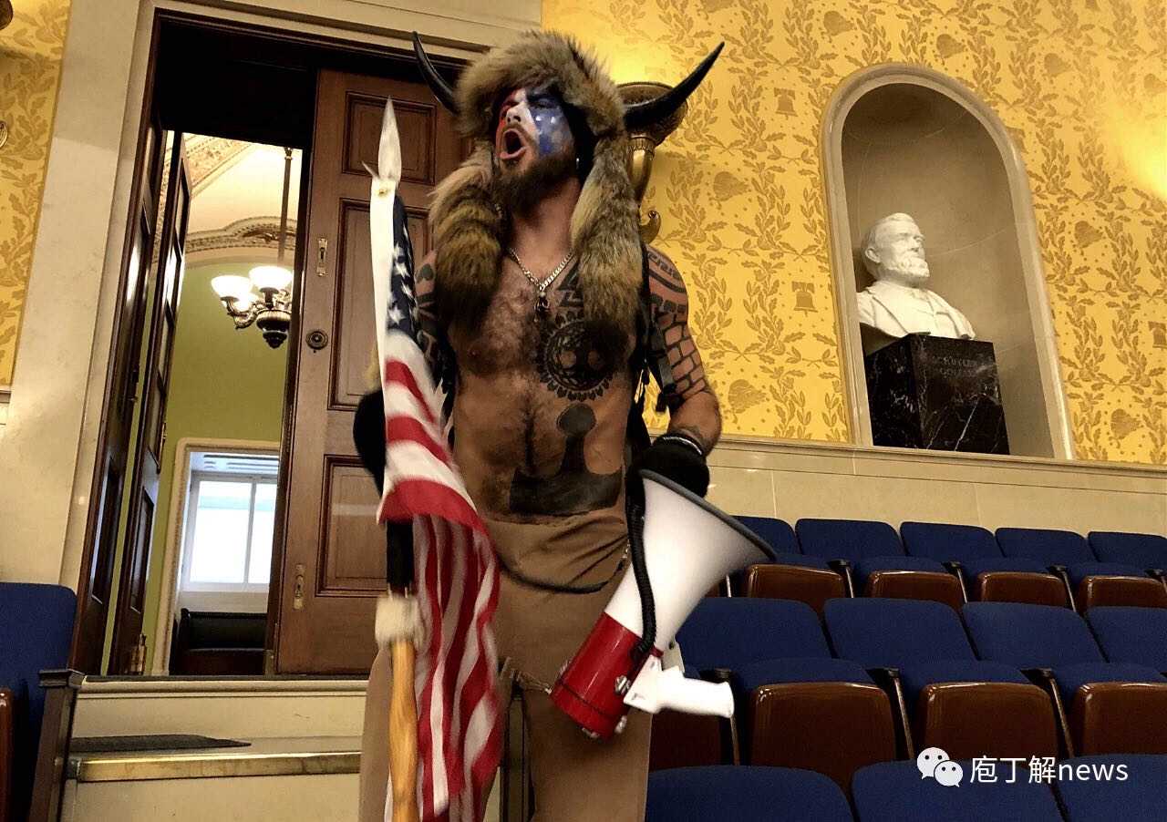 这名来自亚利桑那州的示威者名叫杰克·昂格利。他高呼着“自由”,用长矛敲击地板。他的呼嚎声,伴随四周的警报声在参议院内回荡。他在事件3天后向警方自首,将面临非法闯入国会和妨碍治安等指控。