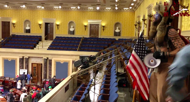 14时48分,当我进入参议院时,一位戴着“美国再次伟大”红帽的示威者,正坐在应由彭斯就坐的议长席上。一个上身赤裸、面涂美国国旗妆、头戴维京式牛角皮帽的示威者,手持挂着美国国旗的长矛,出现在我身后。