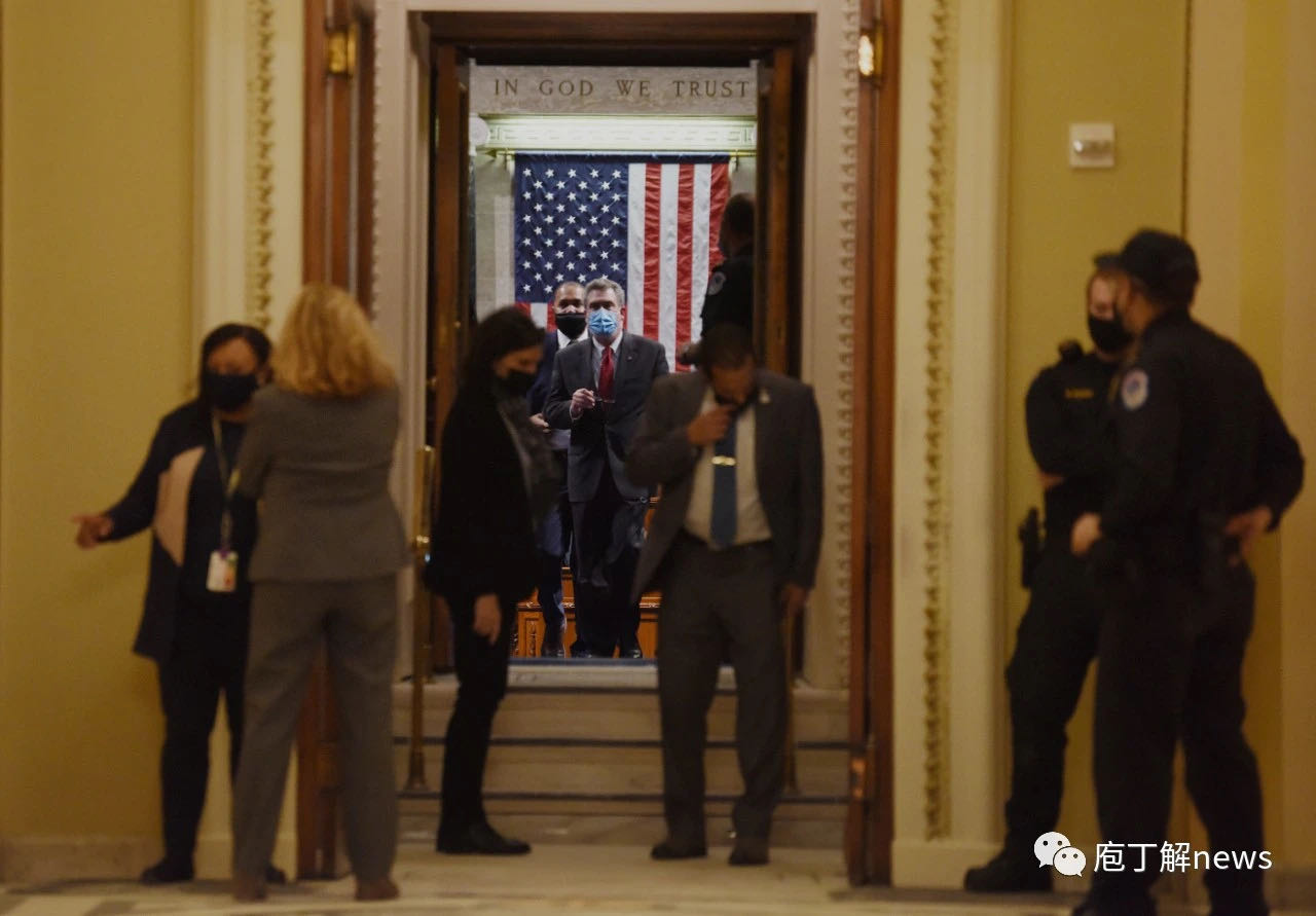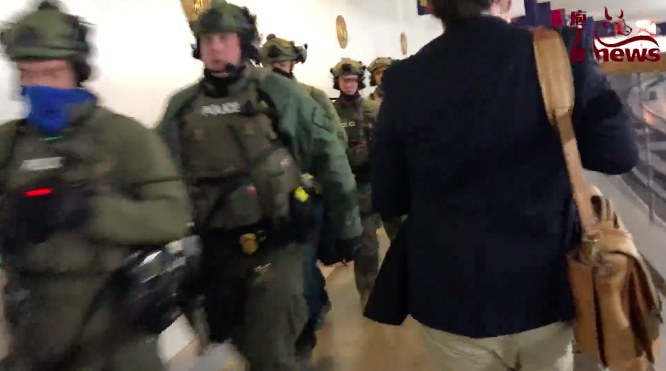 我们随后反锁了办公室门,但依然有示威者前来砸门。直至16时30分许,我才与部分被困的记者和工作人员一道,由警察护送沿国会地下通道撤离至国会北侧的哈特参议院办公大楼。