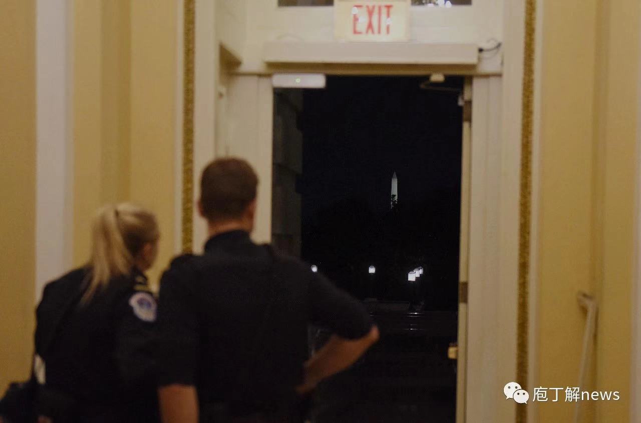 此时,在美国政治的议事厅外,各个入口都站满了全副武装的警察。早前被示威者占据的中央大厅和雕像大厅,变成警员们休整的场所。在一层最先被砸开的门窗前,不时有警员疾步行过。当他们驻足勘察事件留下的混乱现场时,夜幕中的华盛顿纪念碑清晰可见。