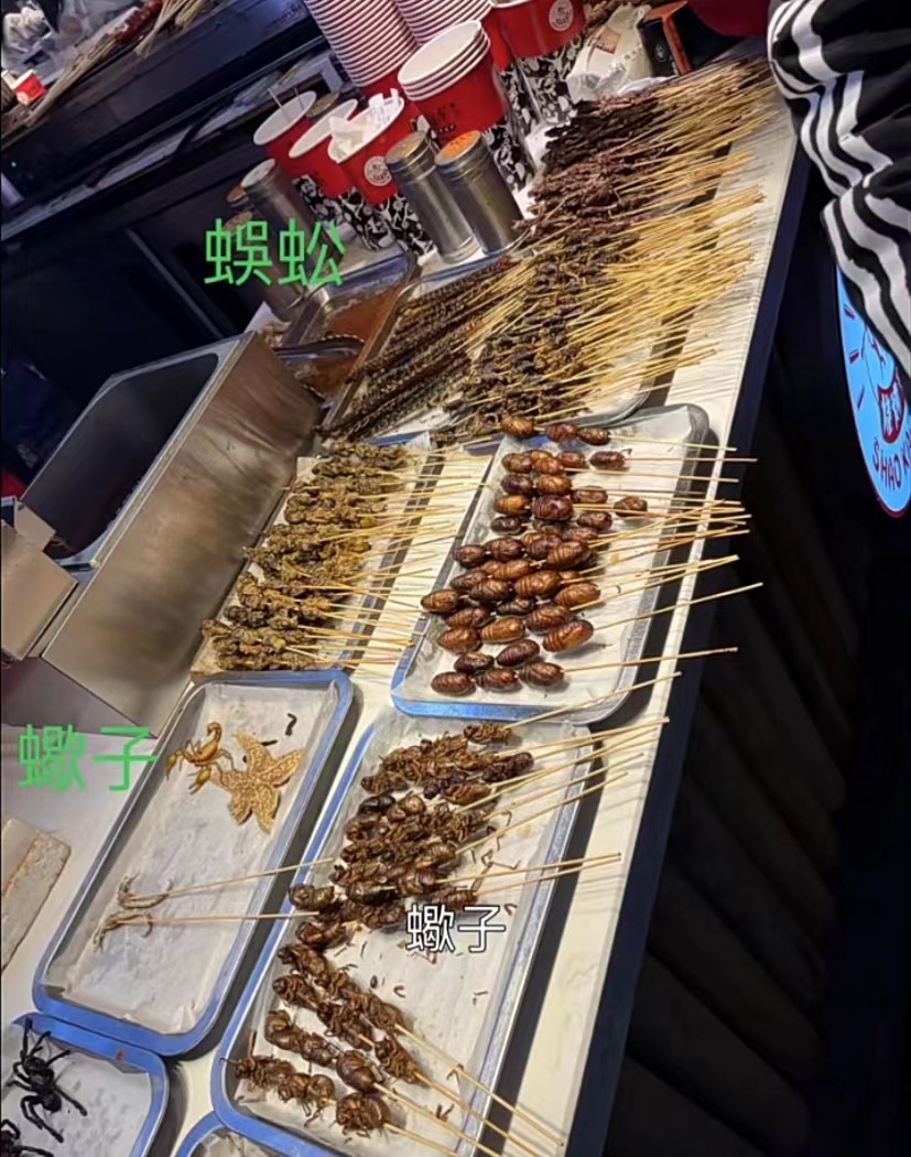 图为中国夜市街头卖蜈蚣炸串、蝎子炸串和知了猴炸串。(图/社交平台“小红书”截图)