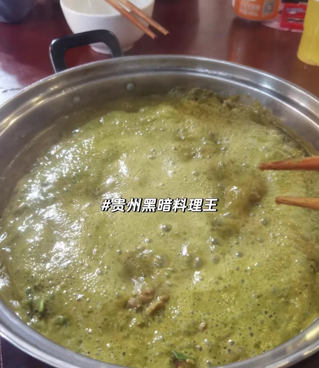 牛瘪汤,说实话看见这个颜色我就觉得难以下咽,但是它确确实实是一道美食,并且不是在什么地方都能吃到的,它是贵州黔东南苗族接待重要客人的时候才会拿出来。这个汤,是将牛胃里没有消化完的草挤出汁液后,放入胆汁及其他食材一起组成的,煮的时候有牛粪的味道,吃的时候稍微有点苦,但是吃完你会觉得这绝对是非常难得的一道美食。这样的美食,很多中国人都觉得不可思议,海外食客见了也许会直接跑路!