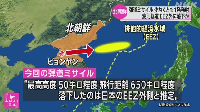 据悉,此次导弹试射的高度为距离地面50公里左右,并且飞行距离大约在650公里。而从导弹的飞行轨迹判断,此次试射的导弹为变轨型导弹,并且确认有一枚已经落在日本的经济水域之外的地区。