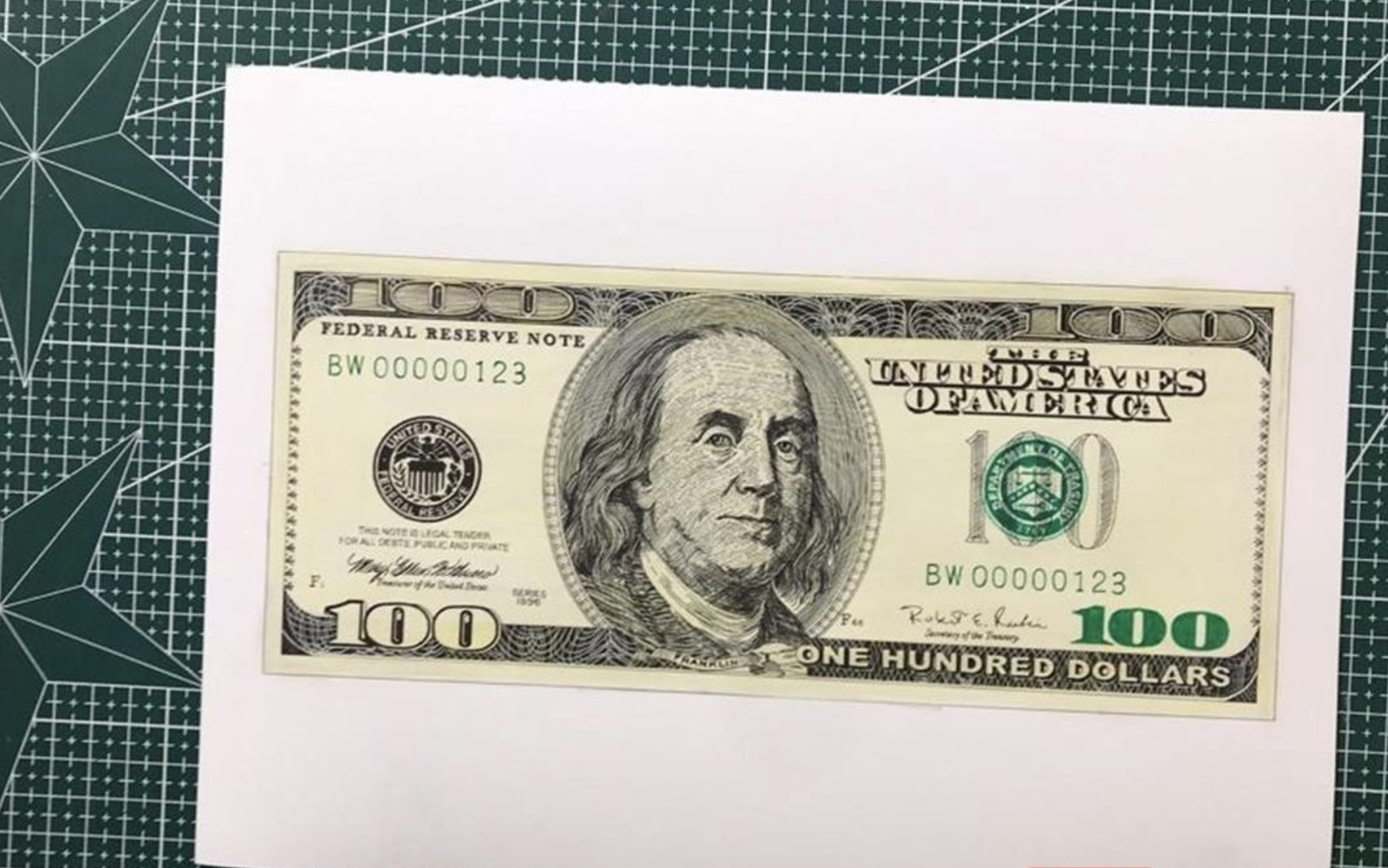 他本想找人买一张真正的美元作为参照,但找了几个平台都没找到,便只能从网上找一张100美元的高清图照着画。