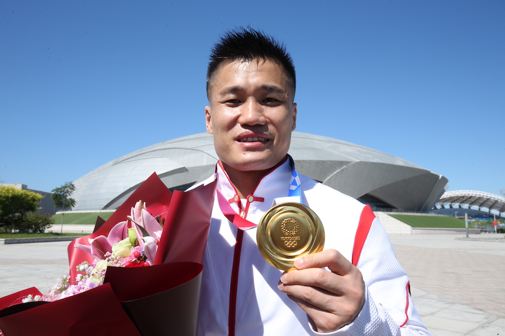 资料图:2021年8月25日,吕小军展示东京奥运会金牌。当天,东京奥运会举重81公斤级冠军吕小军结束隔离返回天津。(图/中新社)