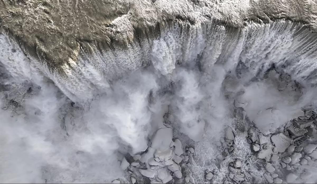 由于这场暴雪,尼亚加拉大瀑布几乎完全冻结,空中拍摄的照片捕捉到了这场灾难性风暴的余波,人行道两侧积雪,瀑布变成了冰山。