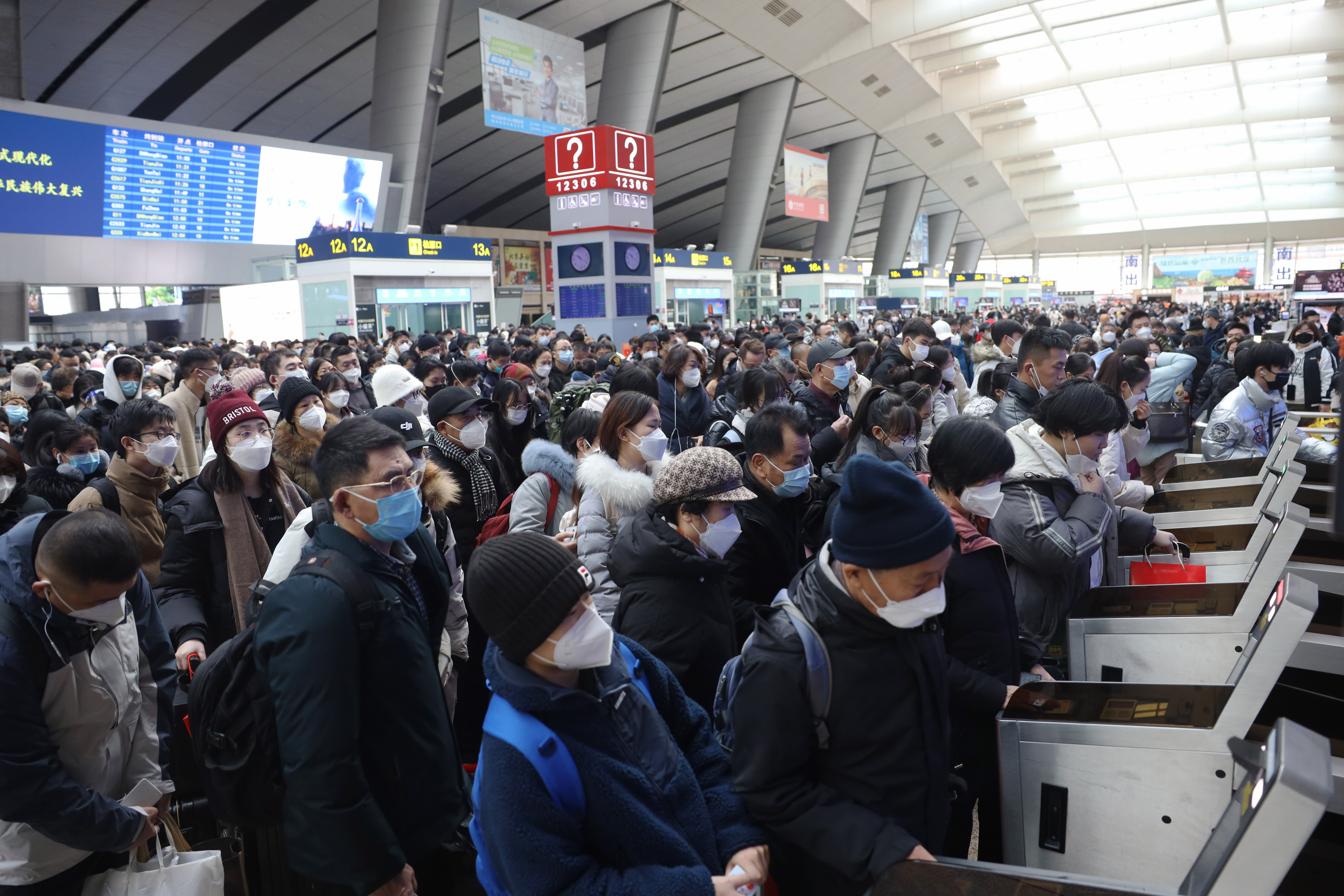 1月7日,为期40天的2023年中国春运大幕拉开,北京南站候车室内人头攒动。 (日本头条郑闻摄)