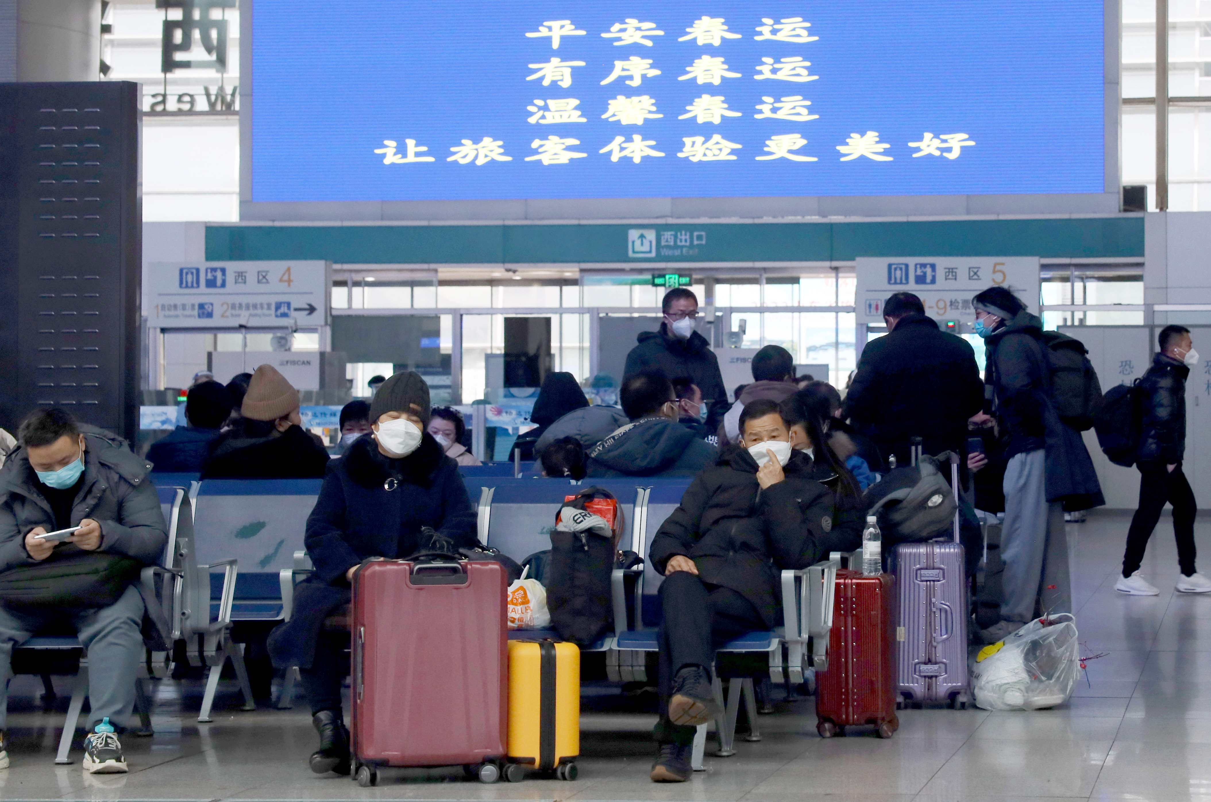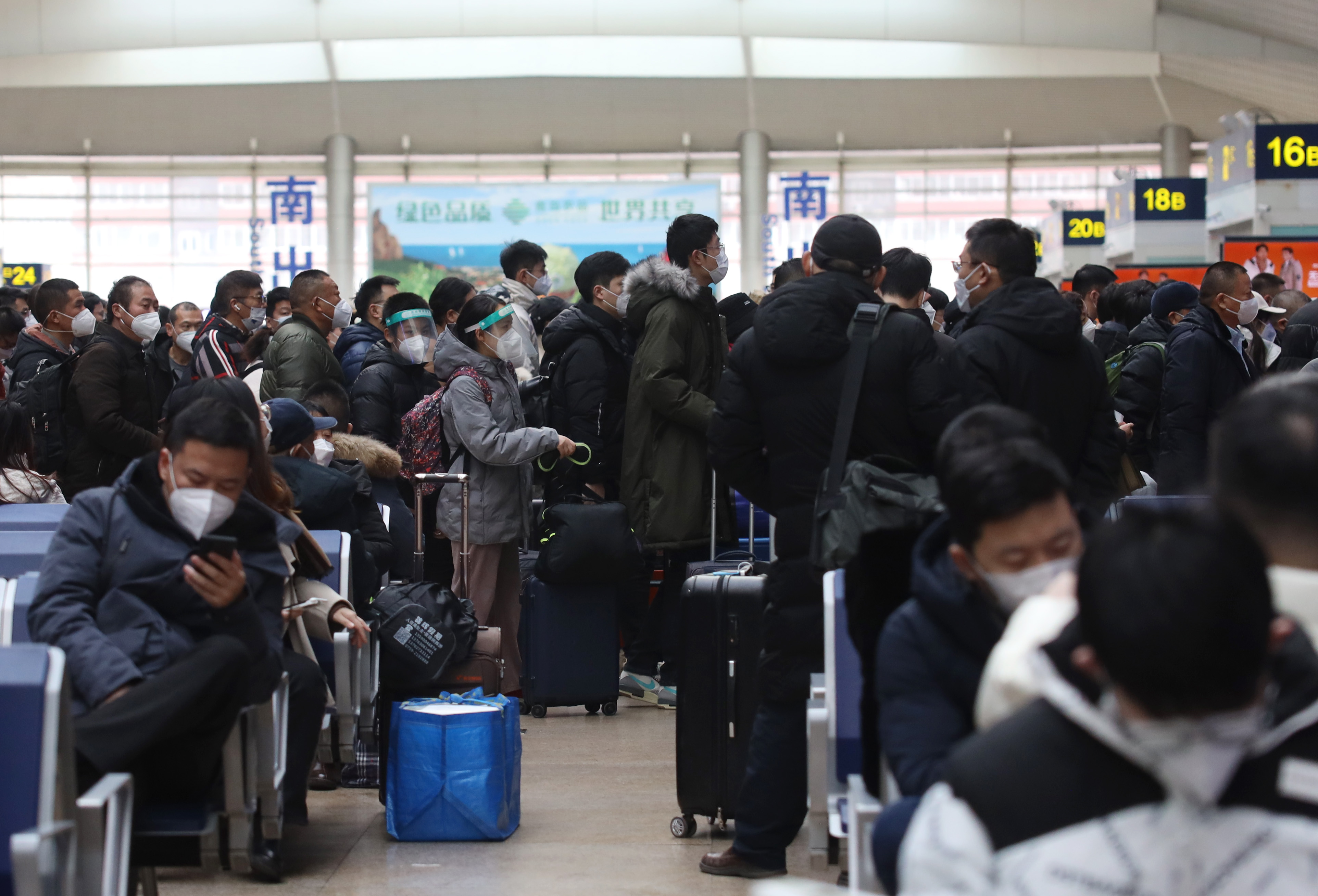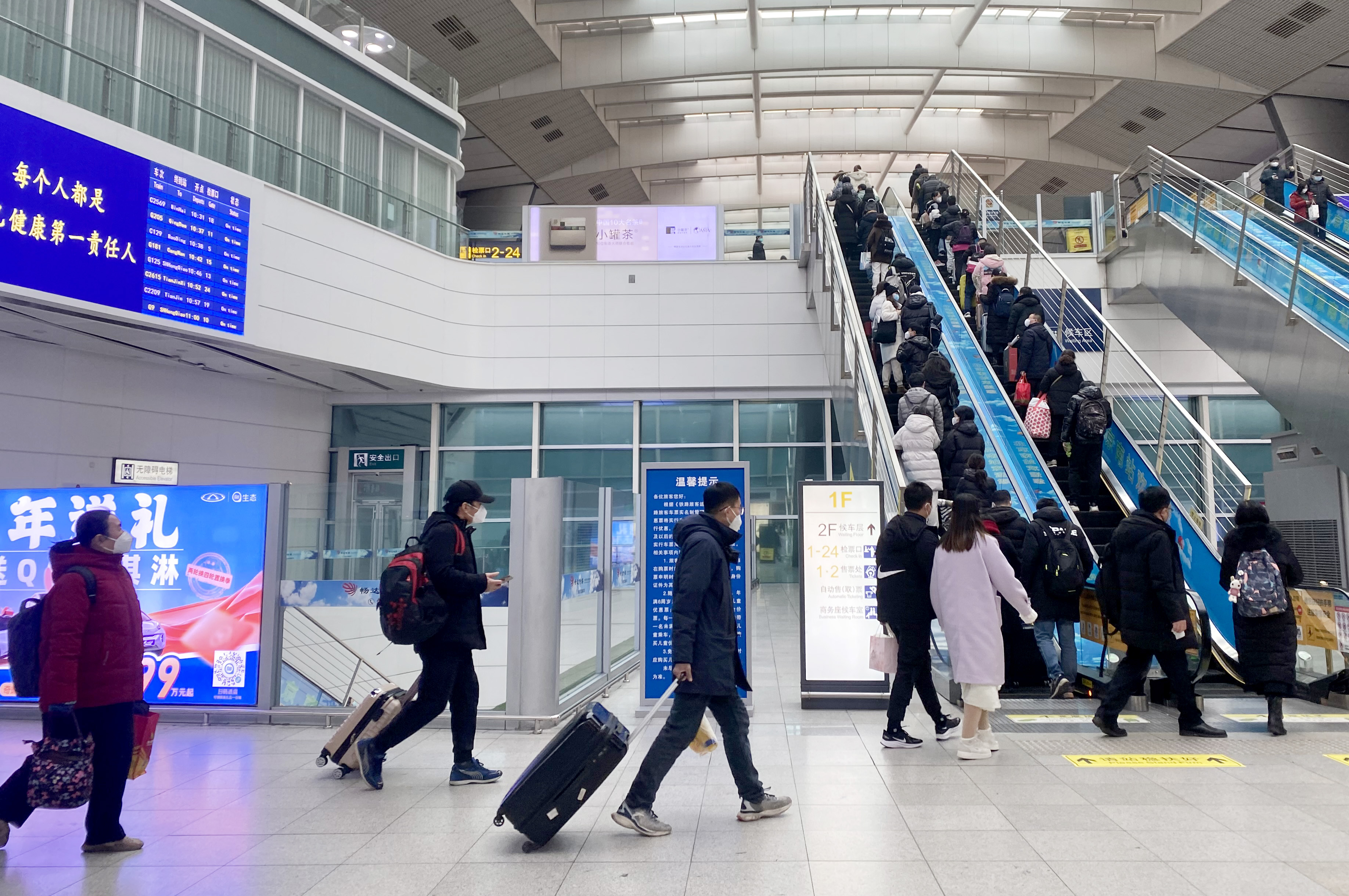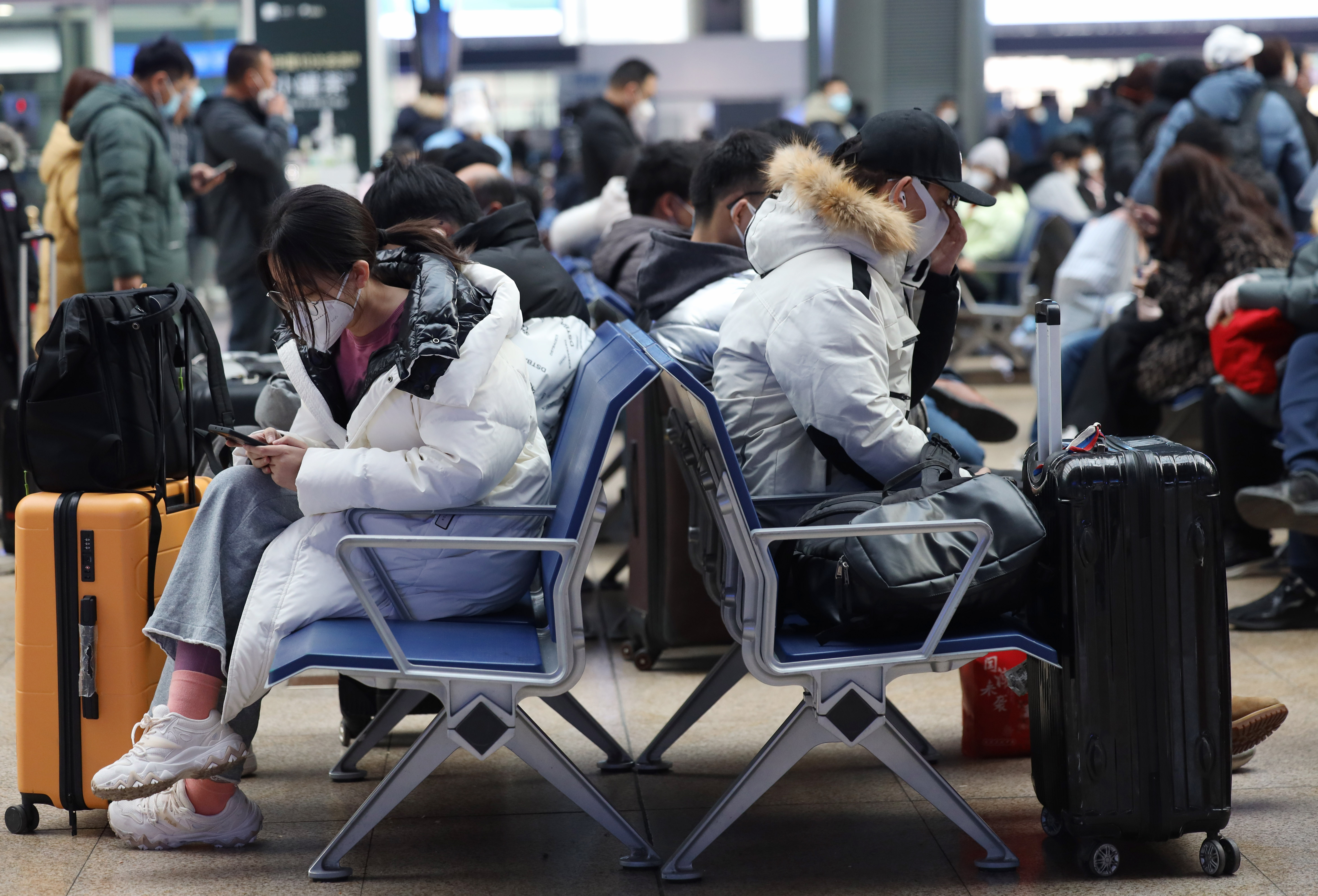 1月7日,旅客在北京南站候车室内等候验票乘车。 (日本头条郑闻摄)