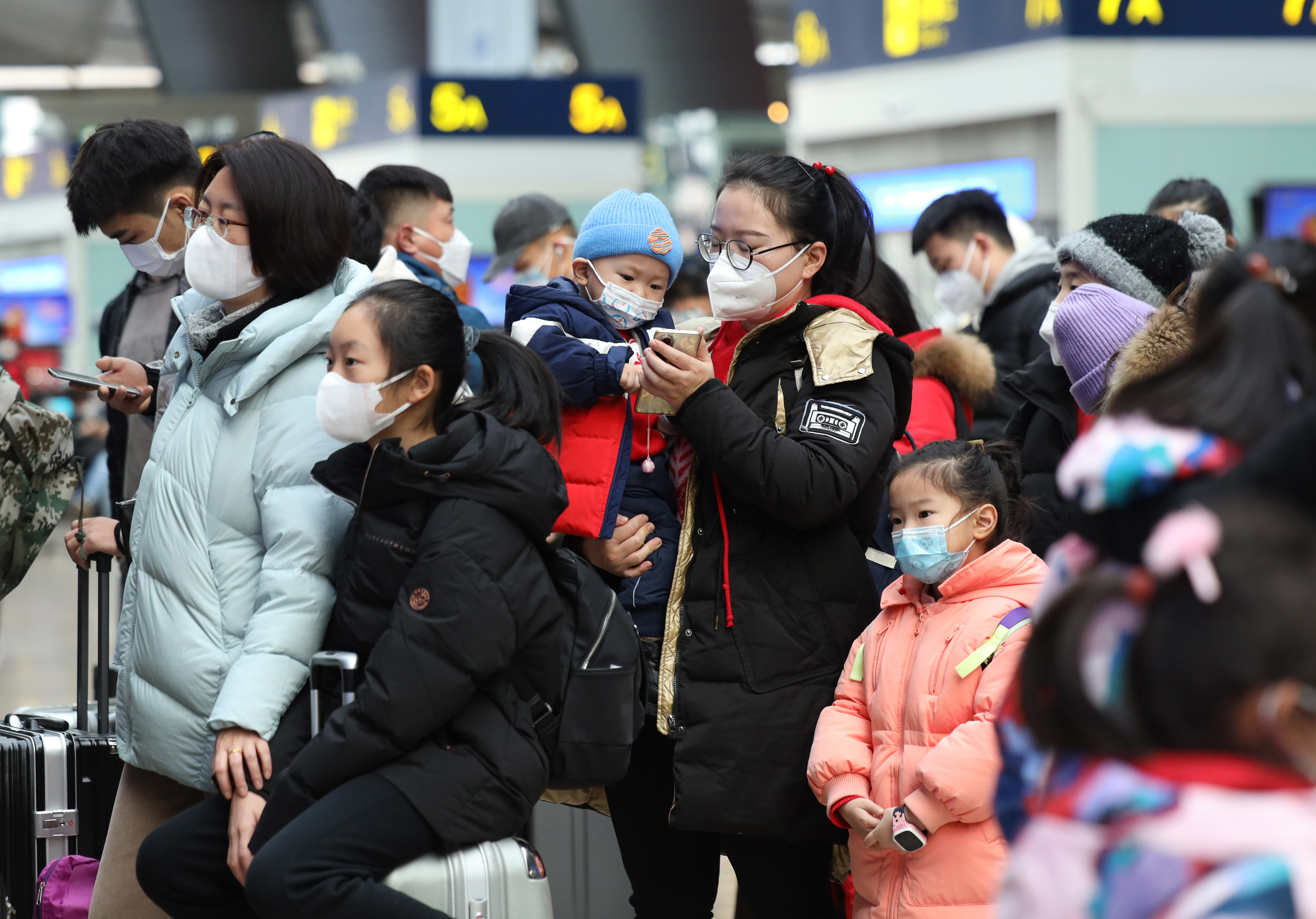 1月7日,小朋友跟随家人排队等候验票乘车出行。(日本头条郑闻摄)
