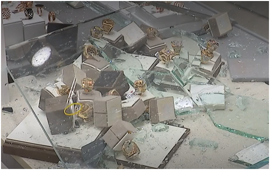 报道称,事发当时是车辆和人流都还不集中的清晨时段,被撞金店也还未开始营业,由此避免了重大事故的发生。但金店铁门已经破损,内部也被撞得狼藉不堪,部分货架和柜台被撞得粉碎,里面的金银首饰散落各处,和玻璃碎片掺杂在一起。