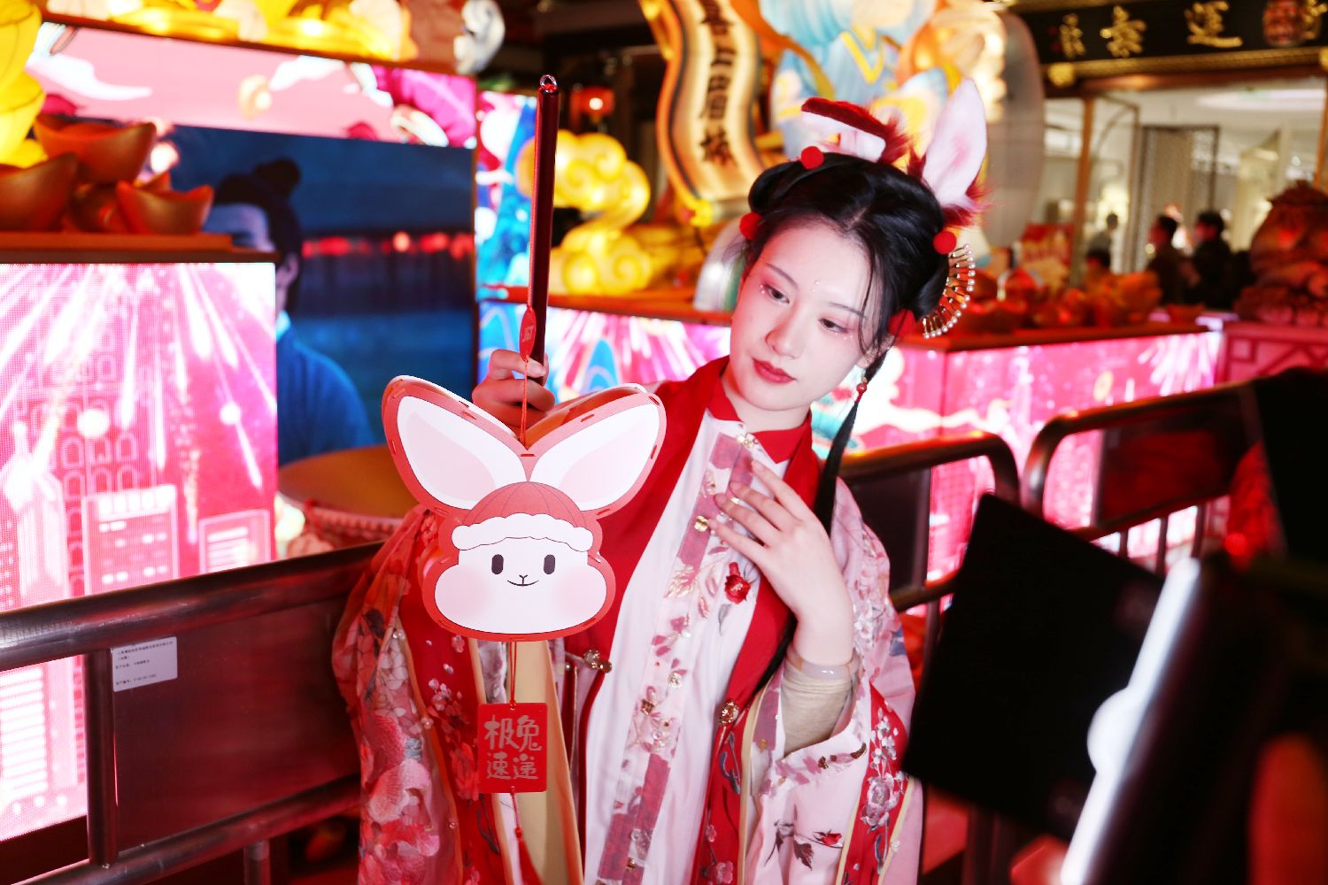 汉服美女手拿糖葫芦亮相豫园兔年春节民俗艺术灯会。(中新网)