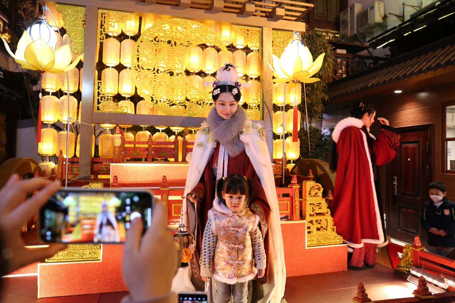 古装汉服美女在豫园民俗艺术灯会主办方特设的“天宫舞台”为游客提供合影服务。(中新网)