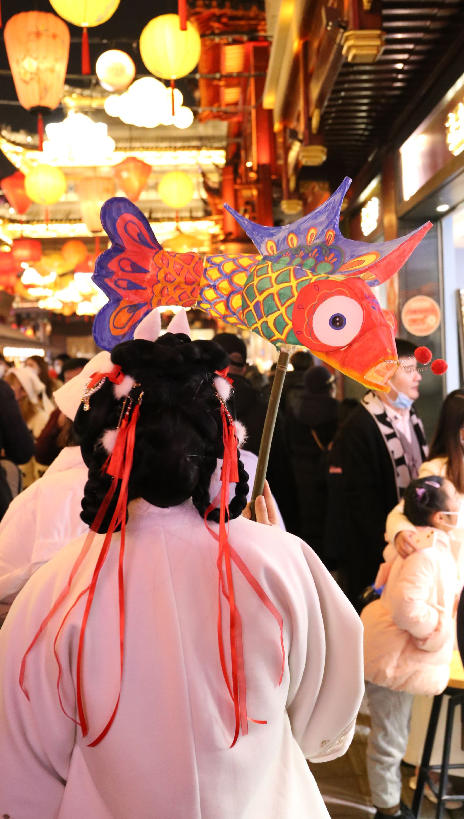 古装汉服美女拿着锦鲤灯饰在豫园民俗艺术灯会走过,展现中国国风服饰魅力。(中新网)