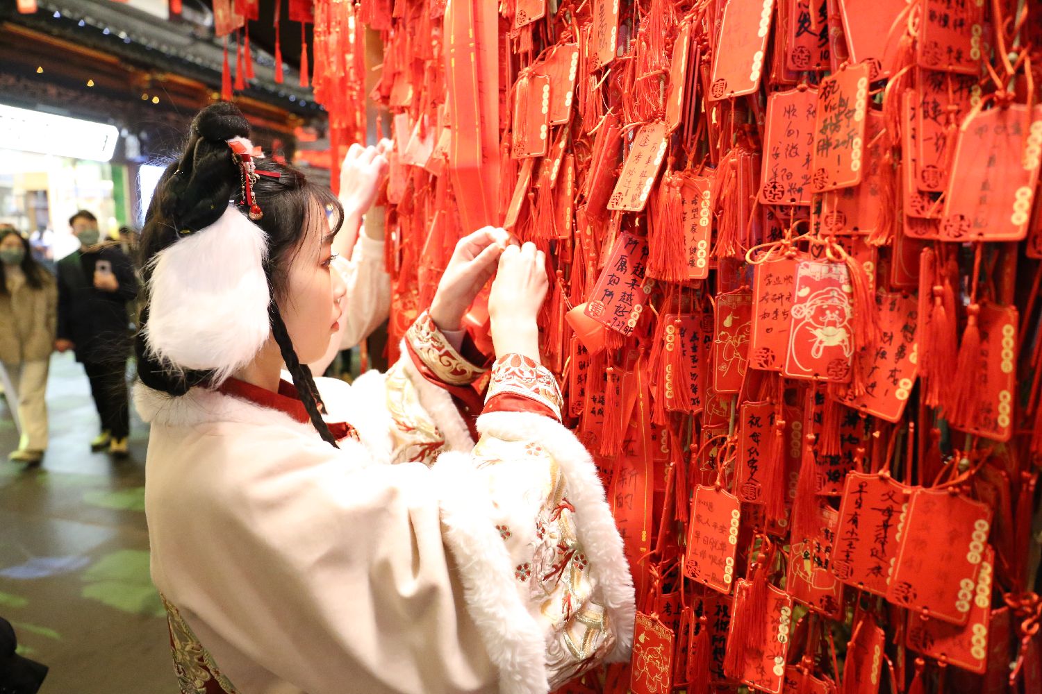 汉服美女在豫园兔年春节民俗艺术灯会上挂祈福卡片。(中新网)