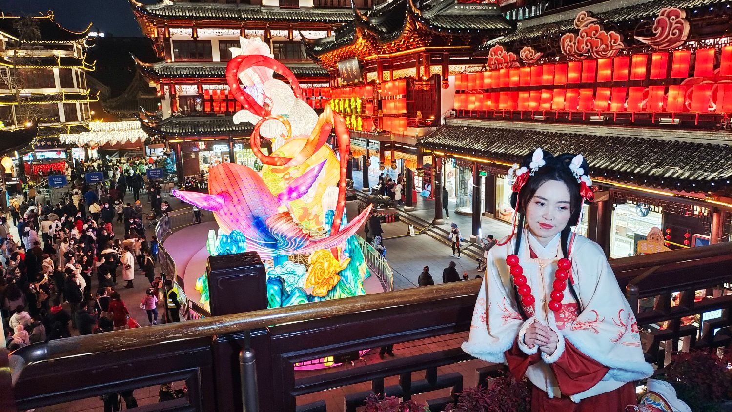 近日,中国上海,汉服美女亮相上海豫园兔年春节民俗艺术灯会,古装造型仙气十足,与历史古建筑群夜景及新年彩灯和谐搭配。其中有的是主办方特设在“天宫舞台”为游客提供合影服务的官方模特,更多的是古风服饰文化粉丝结伴游园。