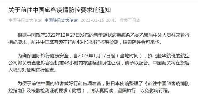 中国驻日使馆:关于前往中国旅客疫情防控要求的通知