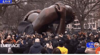 报道称,这座雕塑由雕塑艺术家汉克·威利斯·托马斯(Hank Willis Thomas)创作,名为“拥抱(The Embrace)”,是为了纪念马丁·路德·金夫妇而创作。
