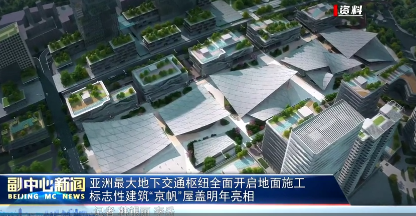 北京城市副中心站综合交通枢纽地上标志性建筑“京帆”屋盖将于明年亮相。(图/北京城市副中心官方视频截图)