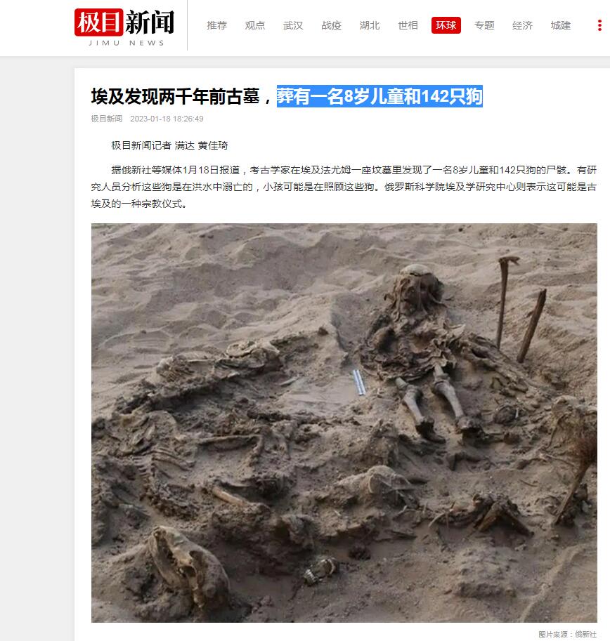 考古学家在埃及法尤姆一座坟墓里发现了一名8岁儿童和142只狗的尸骸。(图/武汉极目新闻网页截图)