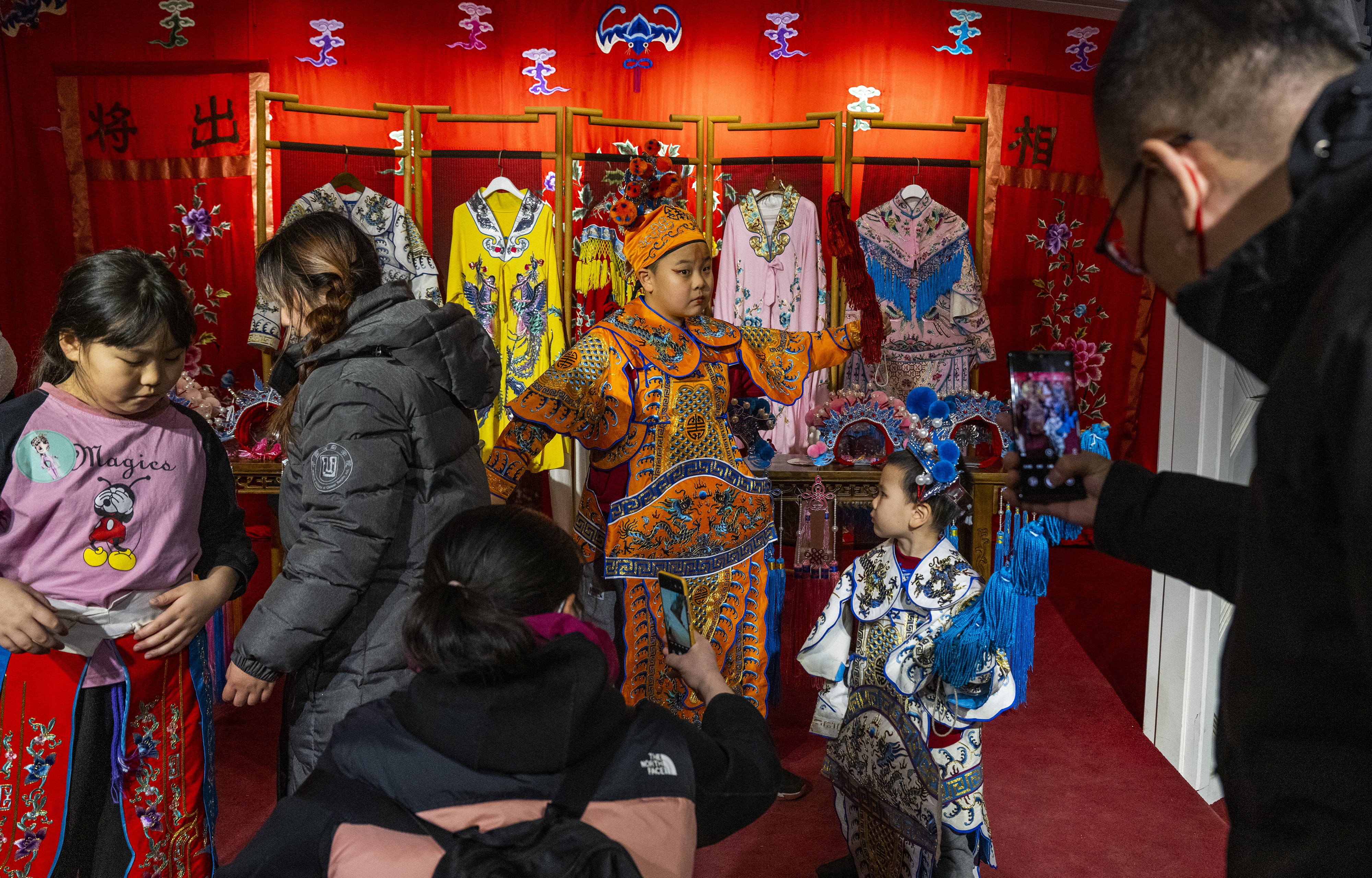 1月24日,中国新年正月初三,北京市前门鲜鱼口的天乐园大戏楼内,民众近距离观摩体验京剧国粹,以传统文化度过春节假期。图为小朋友们在小戏台上体验京剧扮相。 (中新社)