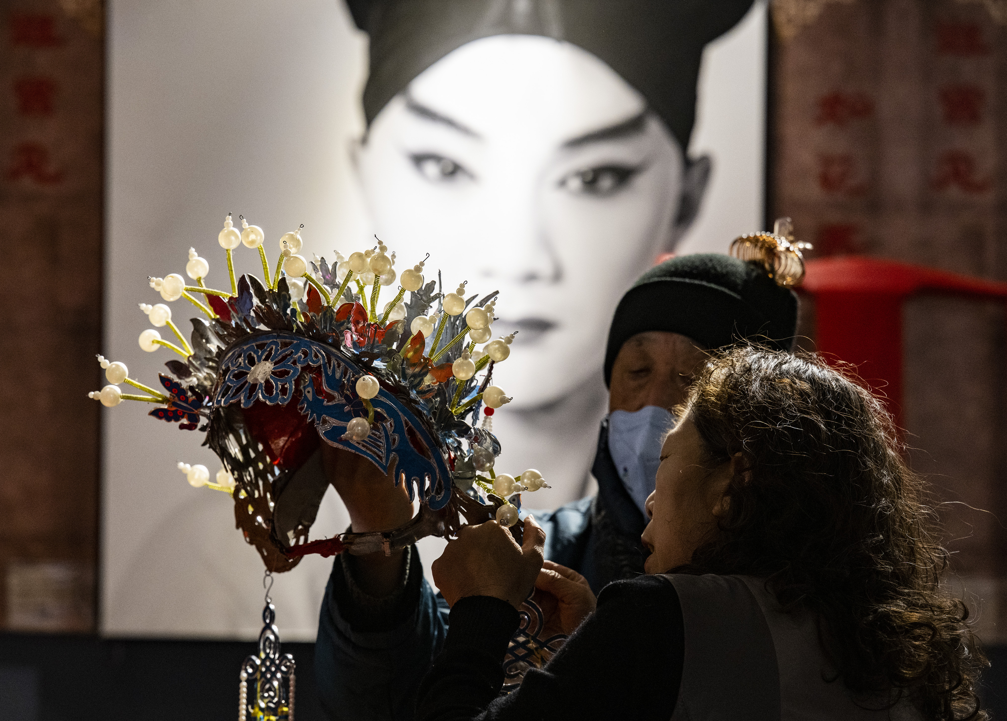 民众在北京前门鲜鱼口的天乐园大戏楼内观赏京剧头面。(中新社)
