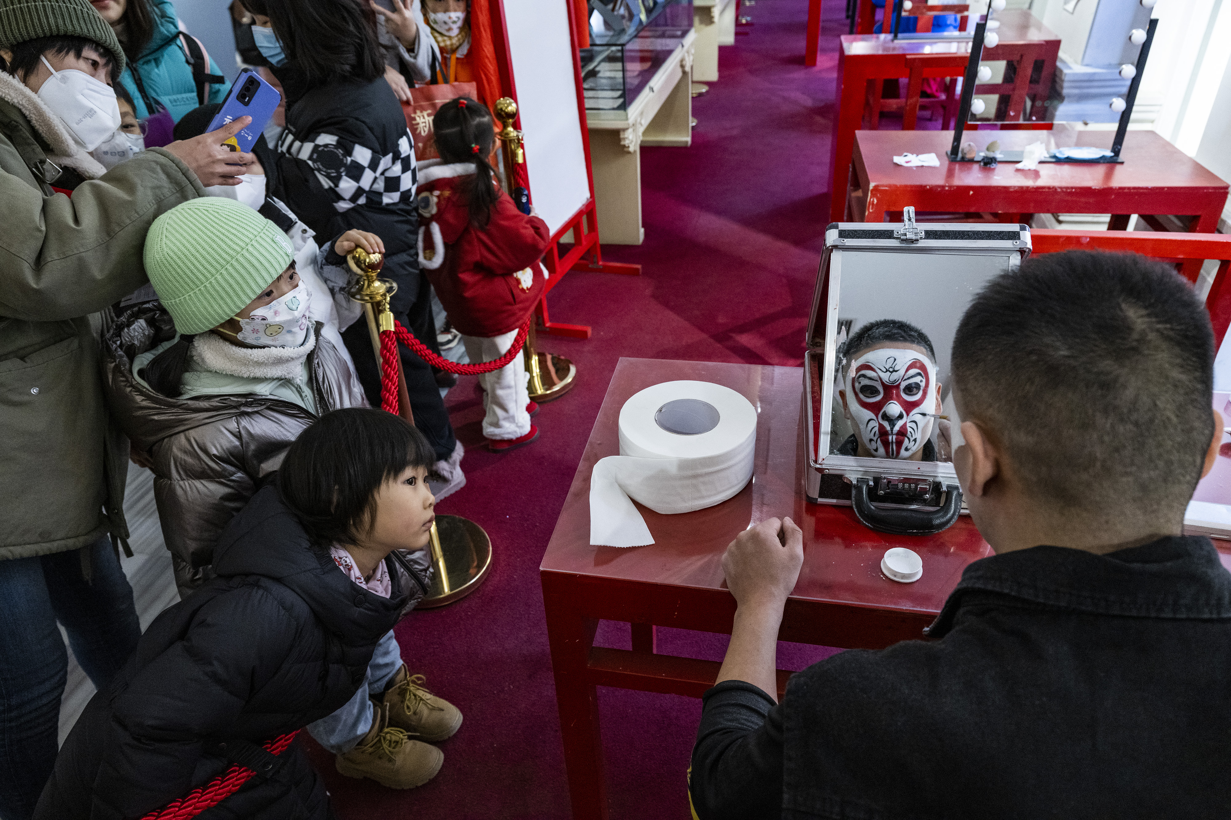 小朋友观看京剧演员化妆。(中新社)