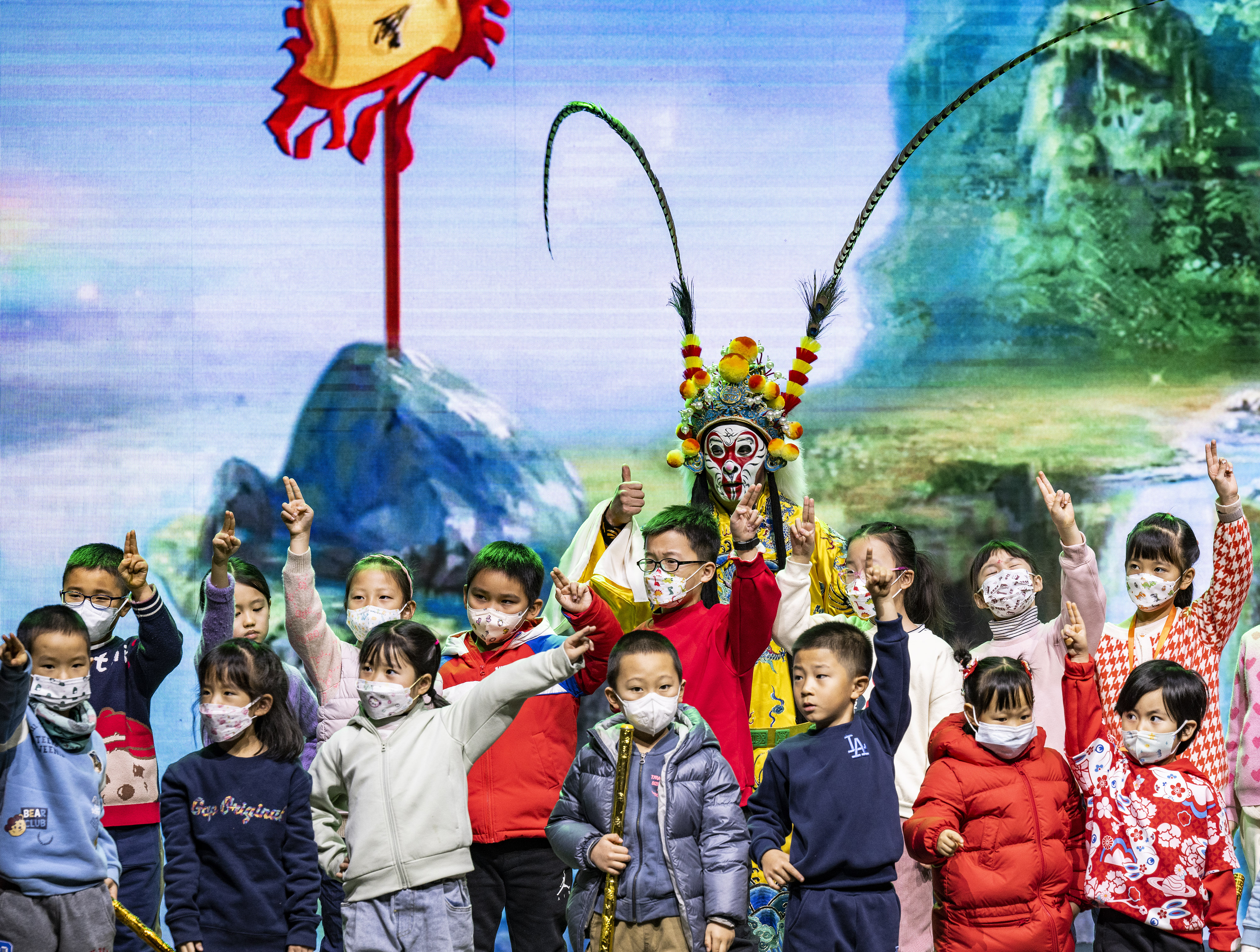 小朋友们参与改编京剧《大闹天宫》的登台互动环节。(中新社)
