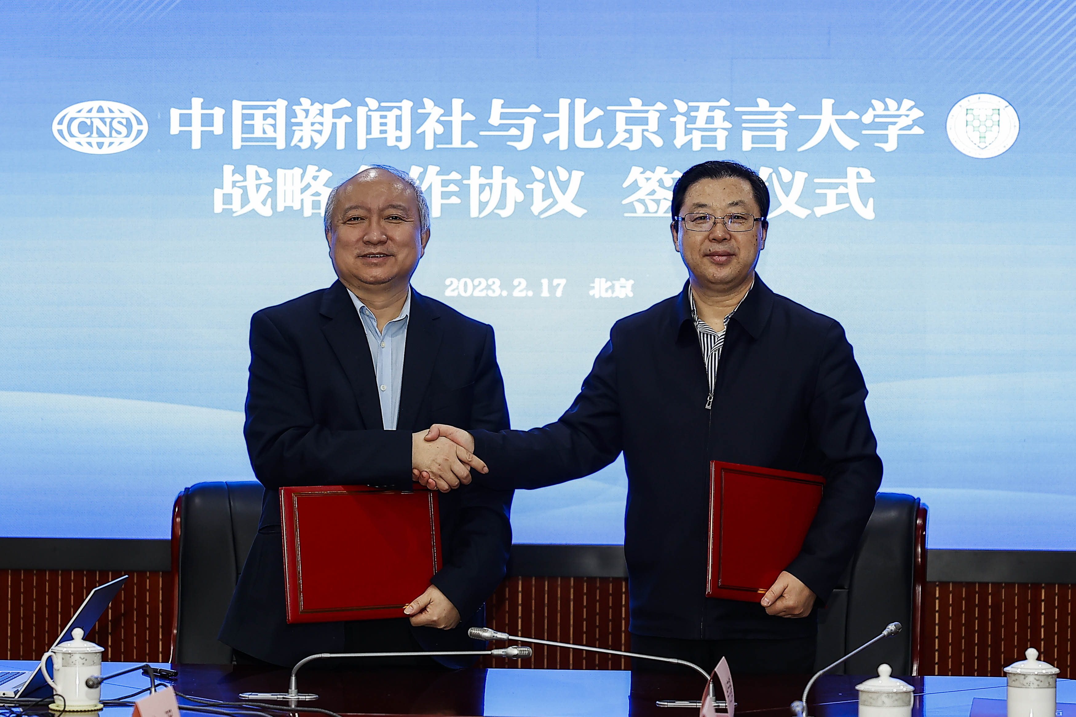 中国新闻社总编辑张明新(左)与北京语言大学校长刘利在签约仪式上合影。(图/中新社)