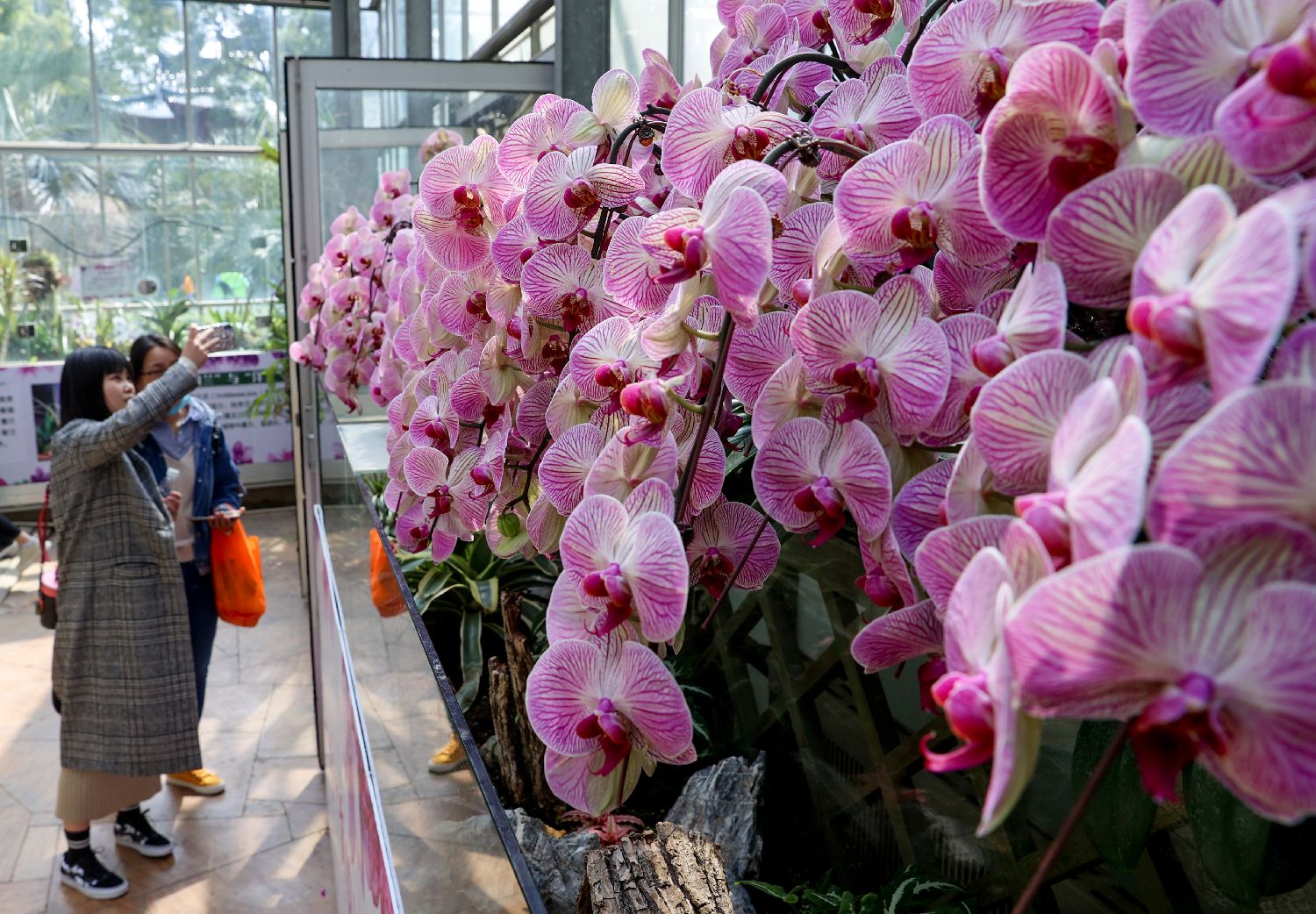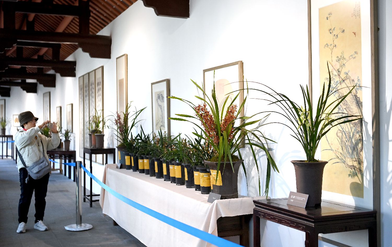此次杜甫草堂兰花展分为兰文化室内展区、室外兰花盆景展区和兰花书画艺术长廊展区三个部分,展览将根据兰花品种的观赏期,分四次向社会大众展示兰花盆栽1000余盆。图为民众参观兰花展。(中新社)