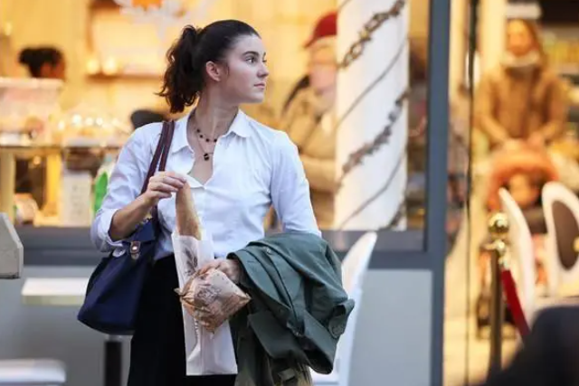 图为在法国巴黎一家面包店外,一名女子拿着刚刚买到的法棍面包。(图/新华社)