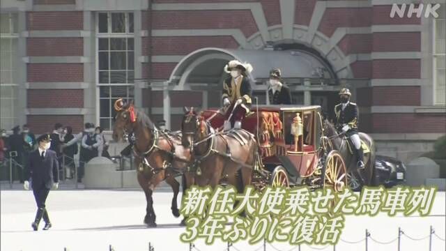 据报道,新型冠状病毒感染扩大以后,为了防止沿途聚集人,令和2年3月被中止,不过,隔了3年再次开始,8日上午,斐济和巴基斯坦的新任大使,在东京站被马车迎接,在皇宫宫殿出席仪式。