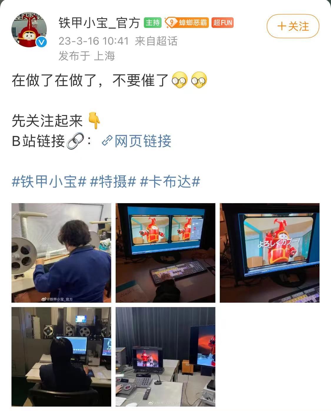 16日,铁甲小宝官方发布了一条微博称“在做了在做了,不要催了”,同时让大家关注B站链接。(图/微博截图)