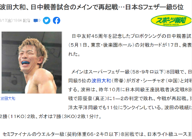 也就是在同一天,日本的《报知体育》等多家媒体宣布说,在5月1日当天,日本的职业拳击圣地后乐园将进行一场中日之间6vs6的较量。