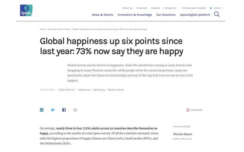 近日,国际知名民调机构益普索集团(Ipsos)发布了一份有关全球幸福指数的调查报告,结果显示,在32个国家中,幸福感指数最高的国家是中国(91%),其后是沙特阿拉伯(86%)和荷兰(85%)。