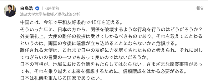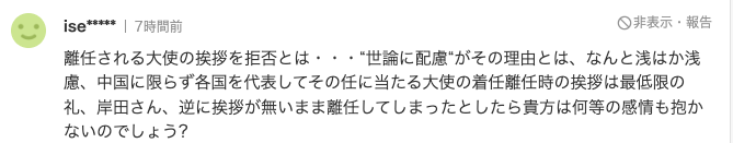 日本网友也表示:“拒绝会面离任大使和‘顾及舆论意见’是多么浅薄可笑。不光是中国大使,面对任何国家的卸任大使在离别前会面都是最起码的礼节。岸田先生,如果我没有打招呼就离职的话,想必你也不会有任何情绪吧?”