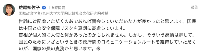 九州大学院比较社会文化研究院教授益尾知佐子表示:“如果顾及舆论的话,应该要跟大使会面比较好。或许岸田个人跟大使间发生过什么事情,但不带个人情感、为了国民在关键时刻维持政府间的沟通管道,应该是身为国家领袖的责任与义务”。