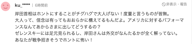 另一位日本网友也表示:“岸田首相真的幼稚!做的事情也不够成熟!一个成熟的人应该要有宽广的心态,而你岸田根本不懂什么是外交。我真担心会因为你而招来一场战争!“