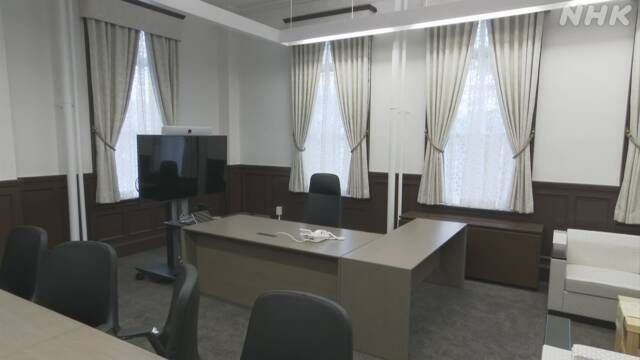 局长办公室位于旧主楼的二楼,有一张办公桌和一个用京都西阵织装饰的访客沙发。还安装了一个带有壁挂式视频投影系统的房间,以实现在线会议。