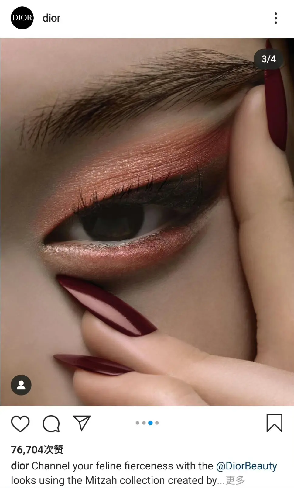 迪奥彩妆广告中,亚裔模特用两根手指卡在眼睛中间,把眼角提拉起来,让眼妆更加突出。但有不少网民表示,模特的这个姿势让人看着不舒服,疑似歧视亚裔。