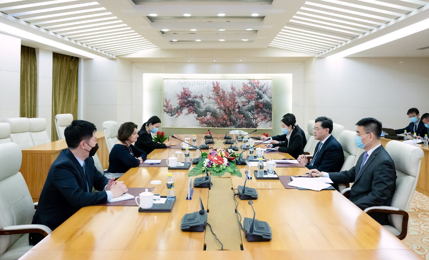 4月11日,中国国务委员兼外长秦刚在北京会见联合国政治和建设和平事务副秘书长迪卡洛。(图/新华社)