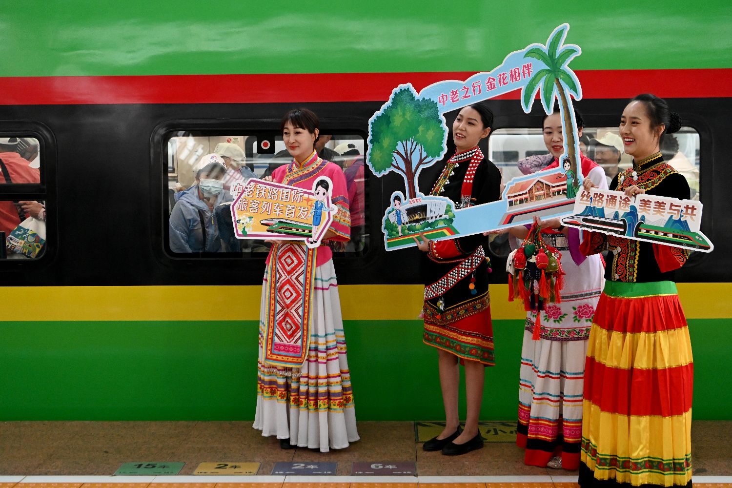 北京时间4月13日8时8分,D887次“复兴号”动车组从中国昆明南站出发,将于10小时30分后到达万象站。这标志着中老铁路国际旅客列车正式开行。图为列车员在昆明南站站台迎接旅客。(图/中新社)