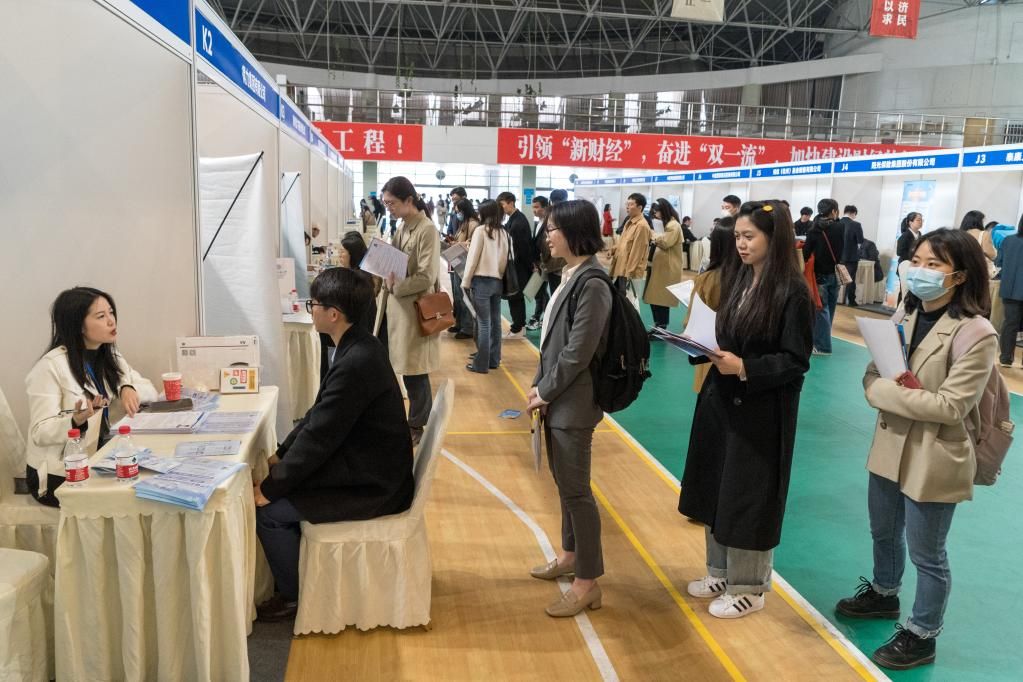 图为2023年3月30日,四川成都,在西南财经大学2023届毕业生春季大型双选会现场,学生在排队投递简历。(图/新华社)