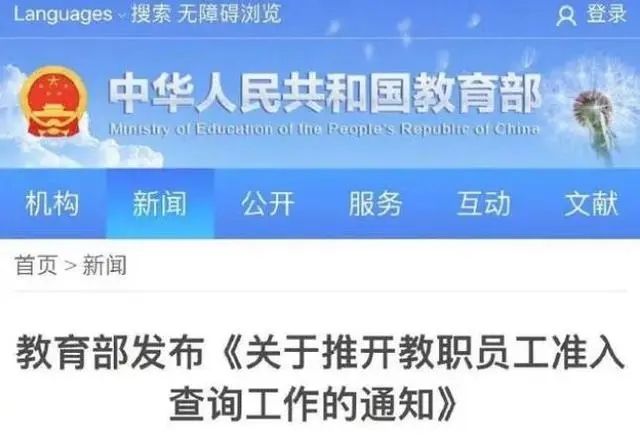中国教育部印发《关于推开教职员工准入查询工作的通知》,要求中小学校和高等学校拟聘用教师在入职前查询相关文件规定的性侵违法犯罪信息和教师法、《教师资格条例》规定的已纳入教师资格限制库的丧失、撤销教师资格信息。