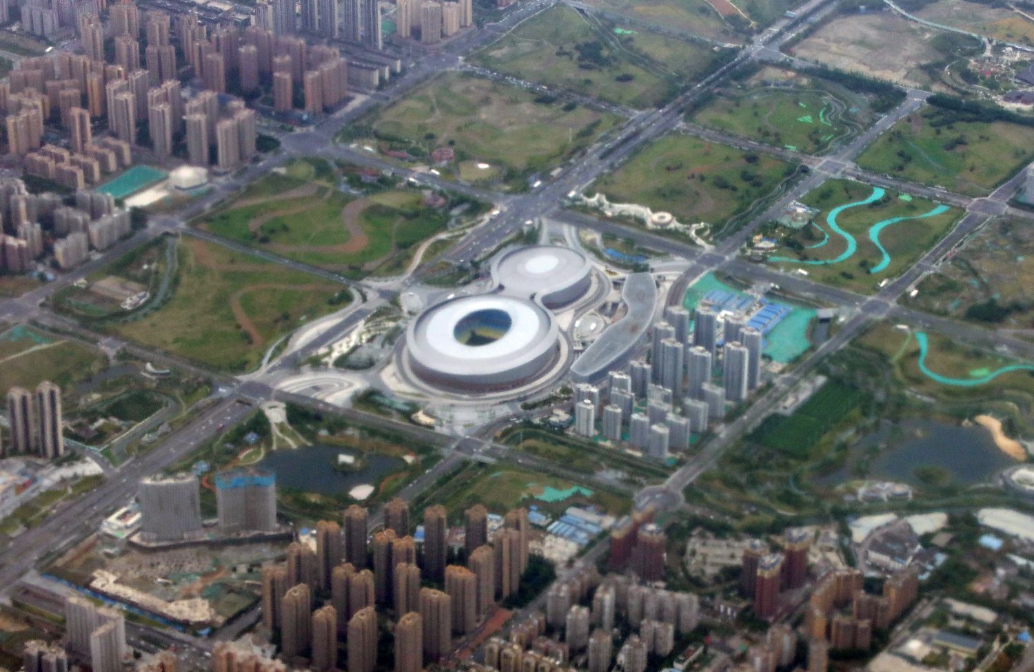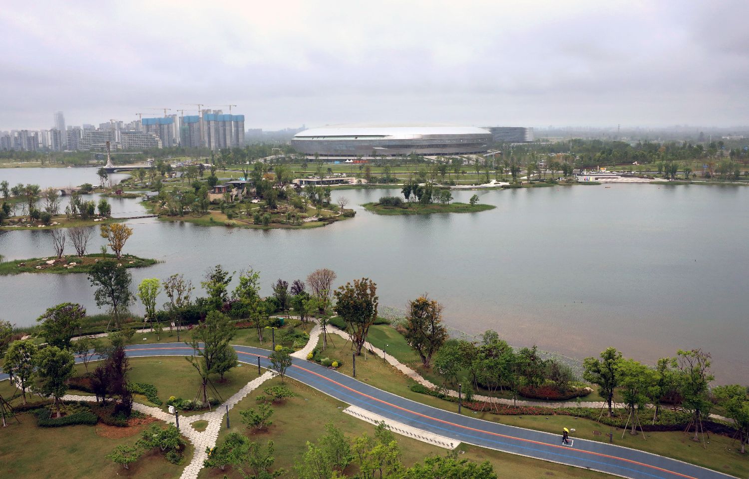 4月23日,高空俯视成都凤凰山体育公园,由足球场和综合体育馆“一场一馆”及配套商业组成,大运会篮球赛事将在这里举行。(日本头条郑闻摄)